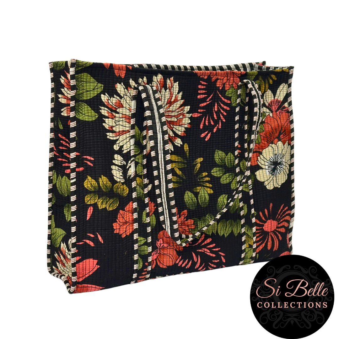 Immerse yourself in a vibrant jungle paradise with this stunning block-printed tote. Crafted with plush padding for comfort and durability, it's perfect for everyday adventures. The contrasting lining and piped binding add a stylish touch, while the internal pocket keeps your essentials organised. This bag is as wild as you are.