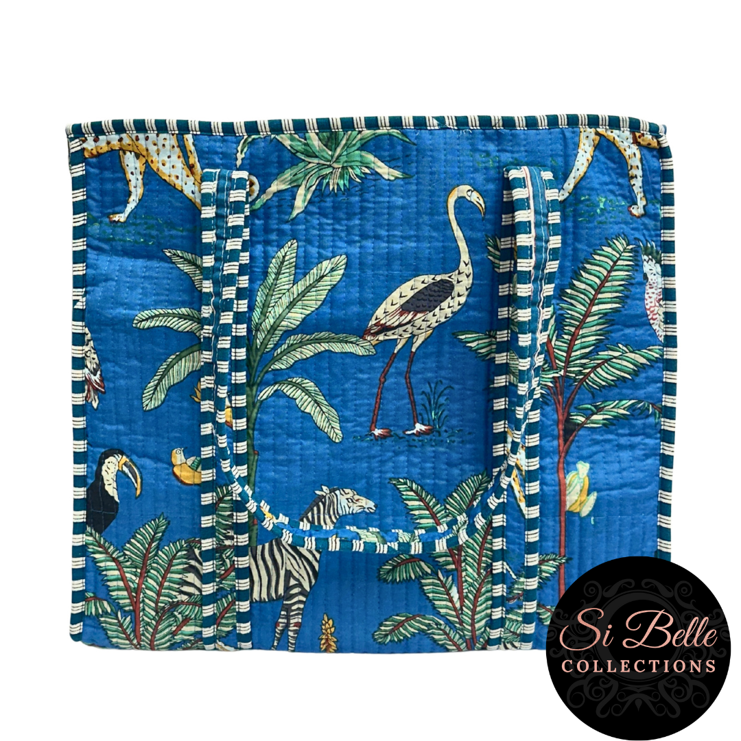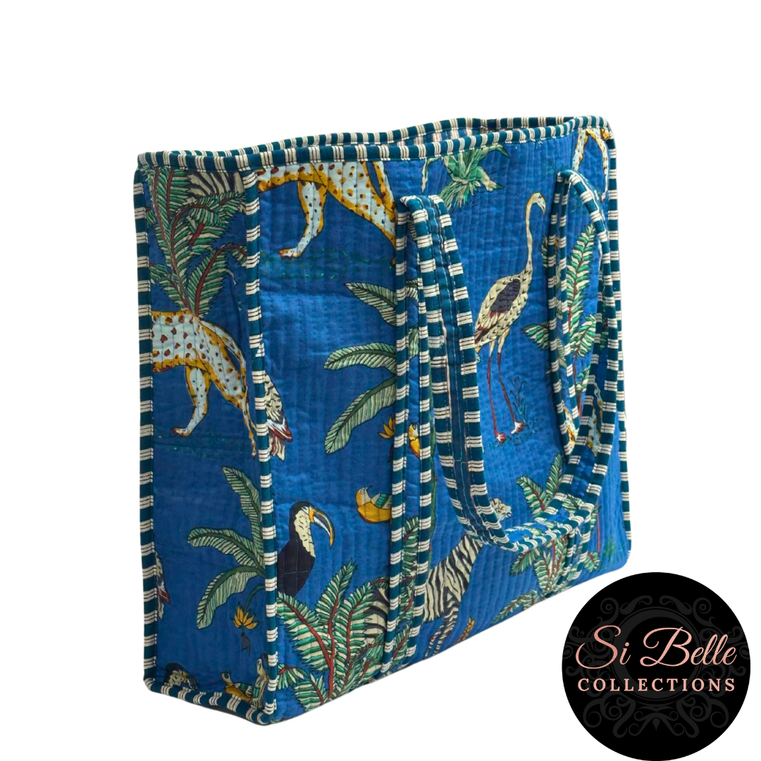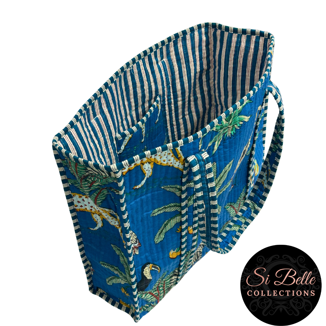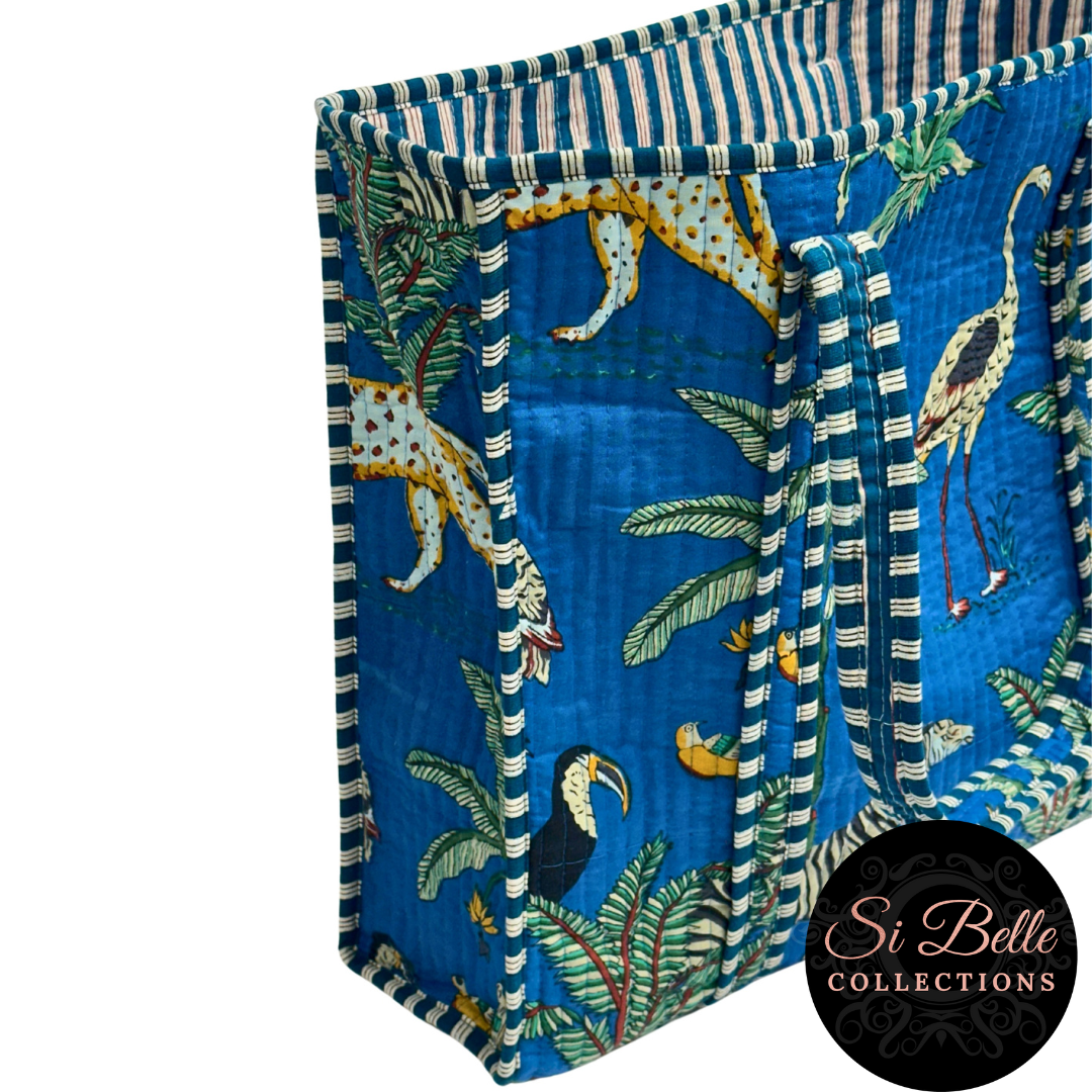 Immerse yourself in a vibrant jungle paradise with this stunning block-printed tote. Crafted with plush padding for comfort and durability, it's perfect for everyday adventures. The contrasting lining and piped binding add a stylish touch, while the internal pocket keeps your essentials organised. This bag is as wild as you are.